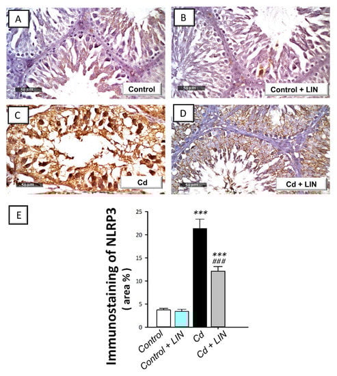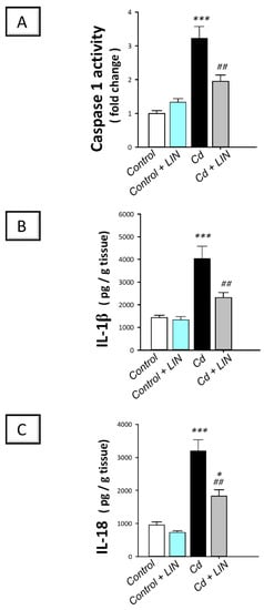 2.5. Linagliptin Administration Impedes Cadmium-Induced NLRP3/caspase-1/IL-1β Axis Activation in Testes of Rats