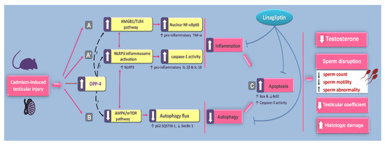 Arab, H.H.; Elhemiely, A.A.; El-Sheikh, A.A.K.; Khabbaz, H.J.A.; Arafa, E.-S.A.; Ashour, A.M.; Kabel, A.M.; Eid, A.H. Repositioning Linagliptin for the Mitigation of Cadmium-Induced Testicular Dysfunction in Rats: Targeting HMGB1/TLR4/NLRP3 Axis and Autophagy. Pharmaceuticals 2022, 15, 852. https://doi.org/10.3390/ph15070852
