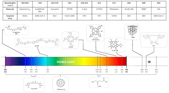 Photosensitizing molecules used in antiviral phototherapy. Organic or nonorganic molecules irradiated in visible and/or infrared wavelengths displayed antiviral activity. Assigned to each molecule are the irradiation wavelength and a target virus.