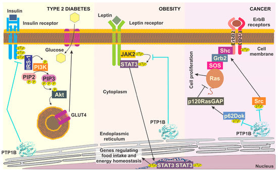 In this sense, protein tyrosine phosphatase 1B (PTP1B) has been established as a pharmacological target for these pathologies. Its substrates are involved in multiple cellular processes, such as glucose homeostasis regulated by insulin signaling, decreased food intake, increased energy expenditure, cellular proliferation, and more. PTP1B is considered an interesting drug target for the treatment of type 2 diabetes because it dephosphorylates the insulin receptor (IR) and the insulin receptor substrate 1 (IRS-1), inactivating the downstream pathway of phosphatidylinositol 3-kinase (PI3K)-Akt and preventing the translocation of glucose transporter 4 (GLUT4) [8,9] (Figure 1). In addition, attention has been on PTP1B as a potentially excellent therapeutic target in obesity, owing to the role that it plays in the regulation of leptin signaling. PTP1B downregulates leptin receptor (LR) stimuli by disrupting the autophosphorylation of JAK2 and subsequent LR phosphorylation, as well as the activation of STAT3, which mediates the transcription of target genes [10,11] (Figure 1). On the other hand, it has been reported that PTP1B can block the induction of cell proliferation and cell survival via the negative regulation of the signaling cascade linking ErbB2-PTP1B-Src kinase, which contributes to the tumor-suppressor function of PTP1B in cancer cells [12,13,14] (Figure 1). However, this last role of PTP1B has become increasingly controversial; for an extensive review, the reader is referred to [15,16]. The above-mentioned controversy highlights the relevance of developing therapies targeting PTP1B in these diseases.