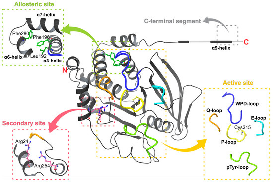 PTP1B was the first PTP structure reported at high resolution [32]. To date, 274 human PTP1B structures have been deposited in the Protein Data Bank (PDB, www.rcsb.org, accessed on 1 February 2022). Of these, around two hundred twenty-five structures are in complex with different ligands: nine in the apo form and the rest with some mutations or chemical modifications, all with a resolution ranging from 1.5 to 3.3 Å. Most crystallographic complexes are formed with competitive inhibitors bound at the PTP1B active site. Nevertheless, there are some complexes with inhibitors bound at distinct sites, such as the C-terminal region of the catalytic domain (helix α9) [33] and at a site formed by helices α3, α6, and α7 called an allosteric site [34] (Figure 2).