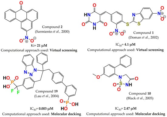 In the year 2000, selective PTP1B inhibitors against leukocyte common antigen-related phosphatase (LAR), receptor protein tyrosine phosphatase α (PTPα), and vaccinia H1-related protein phosphatase (VHR) were identified. These inhibitors were discovered by screening approximately 150,000 compounds with a virtual screening approach. From these compounds, twenty-five molecules were selected according to chemical diversity, interactions, overall fit with the enzyme active site, solubility, chemical stability, commercial availability, and cost. Seven compounds showed a high affinity for PTP1B (Ki = 21–510 µM); compound 2 (2-nitrobenzanthrone, Figure 3) was the most potent inhibitor (Ki = 21 µM) and exhibited selectivity against LAR, PTPα, and VHR (threefold higher for PTP1B). Furthermore, this compound was a mixed-type inhibitor [82]. Later, Doman and colleagues compared two methods to identify PTP1B inhibitors: virtual and high-throughput screening (VS and HTS, respectively). In this study, 235,000 and 400,000 compounds were assessed by VS and HTS, respectively. A total of 127 hits from VS and 85 hits from HTS showed IC50 values <100 µM. Surprisingly, the most potent molecules were discovered by VS, and the hit rate was enhanced 1700-fold compared to HTS, with compound 1 (Figure 3) being the most notable molecule for its inhibitory activity (IC50 = 4.1 µM) [48]. Two years later, another successful case was published by Lau and colleagues. They designed a series of benzotriazole phenyldifluoromethylphosphonic acids through molecular docking on the PTP1B crystal structure. Biphenylphosphonic acid (compound 19, Figure 3) was the most potent PTP1B inhibitor, with an IC50 = 3 nM. In addition, this series of inhibitors was evaluated in several phosphatases, and a moderate selectivity against T-cell protein tyrosine phosphatase (TCPTP) was observed [83]. In 2005, PTP1B inhibitors were designed by optimizing the scaffold 1,2,5-thiadiazolidin-3-one-1,1-dioxide through molecular docking. The analysis indicated that a carbonyl moiety was necessary because it mimics the water-mediated interaction with PTP1B; additionally, the orthogonal orientation between the two rings was significant. These data were corroborated by NMR experiments and enabled identification of compound 10 (Figure 3), the most potent inhibitor (IC50 = 2.47 µM) compared with the other designed molecules [84].