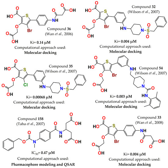 The following year, a series of monocyclic thiophenes were designed through the same computational strategy and guided by X-ray cocrystal structural information. It was observed that a hydrogen bond with Asp48 was key to achieving improved inhibition against PTP1B. Therefore, a carboxylic group was incorporated to promote an electrostatic interaction with Arg47, resulting in significant improvement in inhibitory activity (Ki = 0.14 µM, compound 36, Figure 4) and achieving a 236 and >1000 selectivity ratio against protein tyrosine phosphatase receptor type C (CD45) and LAR, respectively, although selective inhibition vs. TCPTP was not achieved (Ki = 0.18 µM) [85]. Two years later, these authors further pursued the optimization of thiophenes through molecular modeling, considering interactions with Arg24. The structural modification that they included was to remove the N-sulfonyl piperidine, and several side chains were employed to obtain hydrogen bonds with Arg24, which were confirmed by PTP1B-inhibitor crystal structures. The analogous chloro derivative (compound 33, Figure 4) was the most potent inhibitor (Ki = 4 nM); however, its selectivity was not enhanced relative to TCPTP [86]. Wilson and colleagues optimized compound 3 by molecular modeling, guided by X-ray analysis of the PTP1B-compound 3 complex structure. Compound 35 (5-(3-{[1-(benzylsulfonyl)piperidin-4-yl]amino}phenyl)-3-(carboxymethoxy)-4-chlorothiophene-2-carboxylic acid, Figure 4) was the most active, with subnanomolar activity against PTP1B (Ki = 0.00068 µM), and compound 32 (4-Bromo-3-carboxymethoxy-5-[3-(1-phenylmethanesulfonylpiperidin-4-ylamino)phenyl]thiophene-2-carboxylic acid, Figure 4), with a Ki = 0.004 µM, resulted in significant selectivity against CD45 (Ki = 77 µM) and LAR (Ki = >500 µM) phosphatases. In addition, compound 54 (4-Bromo-3-carboxymethoxy-5-(3-{[1-(2,6-dimethylphenylcarbamoyl)piperidin-4-ylmethyl]amino}phenyl)thiophene-2-carboxylic acid, Figure 4) showed selectivity between PTP1B and TCPTP (three times, Ki = 0.009 µM). Furthermore, pharmacokinetics studies determined that molecule 32 displayed an active glucose uptake mechanism into hepatocytes [87]. In the same year, pharmacophore and QSAR approaches were used to discover potent PTP1B inhibitors. Here, previously PTP1B inhibitors were employed to build a pharmacophoric model. The best binding hypothesis was integrated into a QSAR equation, and it was used to carry out a 3D search query to screen the National Cancer Institute database. Furthermore, the selected hits were filtered according to Lipinski’s rules. The five compounds with the highest ranking were evaluated in vitro, with IC50 values from nanomolar to low micromolar (0.47–3.30 µM), with compound 158 (Figure 4) being the most potent [88].