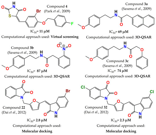 In 2009, another study identified new PTP1B inhibitors through virtual screening. The docking library was taken from the latest version of the chemical database distributed by InterBioScreen. The compounds of this library were selected with drug-like filters and without reactive functional groups. This allowed for attainment of a database with 85,000 compounds instead of the 350,000 originals. Additionally, the authors modified the scoring function of the docking software, implementing a new solvation model. The 225 top-scored compounds were evaluated; 21 compounds had more than 90% inhibition at 100 µM, 9 molecules were identified with IC50 values ranging from 10 to 50 µM, and compound 4 (thiazolidine-2,4-dione derivative, Figure 5) was found to be the most potent [49]. On the other hand, Saxena and colleagues built a 3D-QSAR model (CoMFA model) in order to obtain three N-[2-(4-methoxy-phenyl)ethyl]ace amide derivatives: compounds 3a (N-[2-(4-methoxyphenyl)ethyl]-2-naphthalen-1-yl-acetamide, Figure 5), 3b (N-[2-(4-Methoxyphenyl)ethyl]-2-(2-nitrophenyl)-acetamide, Figure 5), and 3c (N-[2-(4-Methoxyphenyl) ethyl]-2-phenoxy-acetamide, Figure 5). The model predicted that the order of the inhibitory activity would be 3a > 3b > 3c, and the observed order was found to be similar: 3a (IC50 = 69 µM) > 3c (IC50 = 74 µM) > 3b (IC50 = 87 µM). Furthermore, molecules 3a, 3b, and 3c administered at a dose of 100 mg/kg in two in vivo models decreased blood sugar levels by 25.1%, 19.8%, and 24.6%, in a sucrose-loaded rat model and 21.4%, 17.5%, and 20.6% in a streptozotocin-induced diabetic rat model, respectively [89]. A molecular-docking-guided design allowed for the synthesis of a series of di-indolinone derivatives. This strategy led to the discovery of PTP1B inhibitors with an IC50 in the low micromolar range. Compounds 22 (1-[5-(5-bromo-2-Oxo-1,2-dihydroindol-3-ylidenemethyl)furan-2-ylmethyl]-1H-indole-2,3-dione, Figure 5) and 32 (1-[5-(5-chloro-2-Oxo-1,2-dihydroindol-3-ylidenemethyl)furan-2-ylmethyl]-5-chloro-1H-indole-2,3-dione, Figure 5) showed high inhibitory activity (IC50 = 2.8 µM and 2.3 µM, respectively). In addition, both molecules displayed selectivity over other homologous PTPs, such as TCPTP, Src homology-2 protein phosphatase-1 (SHP-1), and LAR of least 4 to 43 times, with IC50 values for TCPTP of 11.5 and 18.8 µM, respectively, and >100 µM for the other phosphatases [90].