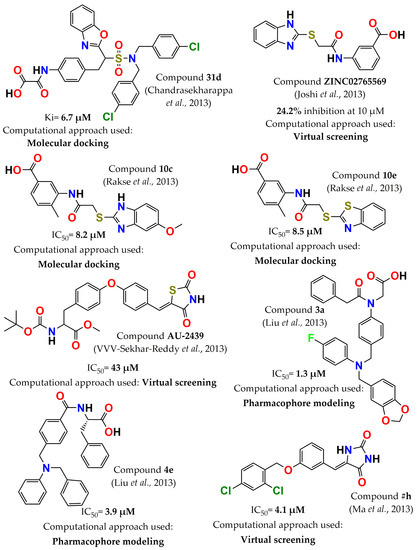 In 2013, various authors reported additional PTP1B inhibitors by employing computational tools. Chandrasekharappa et al. designed a series of benzimidazole and benzoxazole molecules based on molecular docking. The best compounds were selected by employing a flexible docking method, with both PTP1B and TCPTP crystal structures considered. These molecules were synthesized and assessed in PTP1B and TCPTP. Compound 31d (2-((4-(2-(benzo[d]oxazol-2-yl)-2-(N,N-(4-chlorobenzyl)sulfamoyl)ethyl)phenyl)amino)-2-oxoacetic acid, Figure 6) had the highest affinity for PTP1B (Ki = 6.7 µM), but it was not selective [91]. On the other hand, applying a high-throughput virtual screening strategy using the ZINC and IBS databases, a new inhibitor of PTP1B was discovered: ZINC ID: ZINC022765569 (3-(2-(1H-benzo[d]imidazol-2-ylthio)acetamido)benzoic acid, Figure 6). This compound inhibited 24% at 10 µM and decreased the glucose uptake by 18% in L6 muscle cells at 50 µM [92]. Furthermore, this inhibitor was taken as a starting point, and through molecular docking studies, a new series of PTP1B inhibitors was developed. Based on the predicted binding mode, different modifications were proposed, such as a methyl substitution at position 5 in the A ring, a substitution in the benzo ring of benzimidazole, and the replacement of the benzimidazole ring by phenyl oxadiazole. Two series of compounds were prepared, and the two most potent compounds, molecules 10c (3-(2-(5-Methoxy-1H-benzo[d]imidazol-2-ylthio)acetamido)-4-methylbenzoic acid, Figure 6) and 10e (2-Benzo[d]thiazol-2-ylthio)acetamido)-4-methylbenzoic acid, Figure 6), showed an IC50 value of 8.2 and 8.5 µM, respectively [93]. Diphenyl ether derivatives were also identified as PTP1B inhibitors through virtual screening. The study was carried out in both PTP1B and TCPTP using an in-house compound database. From here, forty-three compounds were prioritized based on the docking scores. Compound AU-2439 (Figure 6) was the most potent, with an IC50 of 43 µM. Additionally, it was found to be a selective inhibitor with fivefold selectivity for PTP1B over TCPTP (IC50 =230 µM) [94]. In another study, PTP1B inhibitors were discovered via an integrated molecular design strategy of pharmacophore-oriented scaffold hopping based on the template structure of Ertiprotafib. The information obtained from the interaction mode of Ertiprotafib with PTP1B simulated by molecular docking helped to develop a pharmacophore model for Ertiprotafib. Accordingly, twenty-one molecules from five distinct structural classes were designed and synthesized. Of these, nine molecules significantly inhibited PTP1B with a percentage of inhibition higher than 80% at 100 µM. The two most active compounds were 3a and 4e (Figure 6), exhibiting an IC50 value of 1.3 and 3.9 µM, respectively [46]. Imidazolidine-2,4-dione derivatives were reported as selective PTP1B inhibitors using virtual screening and molecular docking with the core hopping method. The core hopping algorithm helped to find the cores attaching to the scaffold using fragments from the ZINC database. A total of fifty molecules were docked at the active site of PTP1B and TCPTP and; consequently, twelve compounds were synthesized and assessed in both PTP1B and TCPTP. Overall, most molecules were potent and selective, with the compound designed as #h (Figure 6) being the most selective, with a selectivity index of almost 34 times PTP1B (IC50 =4.1 µM) over TCPTP (IC50 > 130 µM) [95].