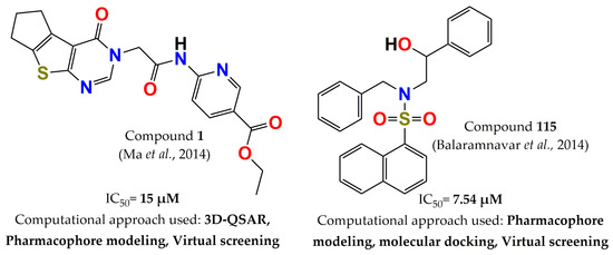 A year later, the same research group designed additional selective inhibitors of PTP1B over TCPTP. In this case, the strategies employed were 3D QSAR, pharmacophore modeling, and virtual screening. All methods were carried out in both enzymes, PTPB and TCPTP, in order to increase the possibility of discovering selective inhibitors. An in-house chemical database was screened, and eight new PTP1B inhibitors were reported. Among these inhibitors, compound 1 (ethyl 6-(2-(4-oxo-4,5,6,7-tetrahydro-3H-cyclopenta [4,5] thieno[2,3-d]pyrimidin-3-yl)acetamido)nicotinate, Figure 7) was the most successful, showing selectivity of eight times for PTP1B (IC50 = 15 µM) over TCPTP (IC50 > 125 µM) [44]. In the same year, another set of PTP1B inhibitors was identified through pharmacophore modeling, docking, and scaffold-hopping techniques. These approaches allowed for prioritization of ten molecules for synthesis from a library of eighty-six compounds. These compounds inhibited PTP1B in the micromolar range, and characterization of the most potent inhibitor (compound 115, N-benzyl-N-(2-hydroxy-2-phenylethyl)-2, 4, 6-trimethyl benzene sulfonamide, Figure 7) showed that it improved oral glucose tolerance and enhanced insulin resistance by restoring the insulin level and normalizing the serum lipid profile when assessed in both C57BL/KsJ-db/db mice and an STZ-induced diabetic rat model. Furthermore, this compound augmented the insulin action by modulating the expression of genes involved in insulin signaling, such as IRS 1-2, PI3K, PTPN1, Akt2, AMPK, and PPAR-α. Other experiments corroborated the antiadipogenic effect of this compound on 3T3L-1 cells, as well as its inhibition of lipid accumulation induced by MDI. In addition, it showed a bioavailability of around 10% in rats after 30 mg/kg oral dosing [96].
