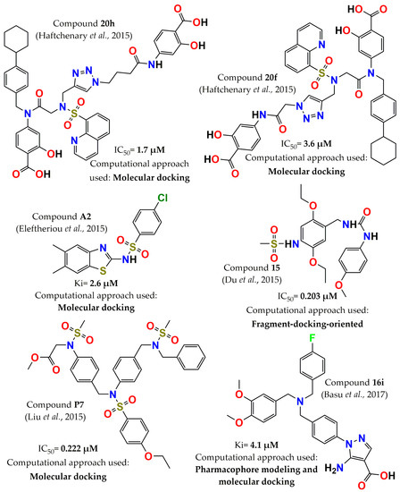 In 2015, a salicylic acid derivative was optimized by employing an in silico docking approach. Compound 20h (4-(4-(4-((N-(2-((4-carboxy-3-hydroxyphenyl)(4-cyclohexylbenzyl)amino)-2oxoethyl)quinoline-8-sulfonamido)methyl)-1H-1,2,3-triazol-1-yl)butanamido)-2hydroxybenzoic acid, Figure 8) exhibited improved potency (IC50 = 1.7 µM) compared with the original. Additionally, compounds 20h and 20f (4-(2-(4-((N-(2-((4-carboxy-3-hydroxyphenyl)(4-cyclohexylbenzyl)amino)-2oxoethyl)quinoline-8-sulfonamido)methyl)-1H-1,2,3-triazol-1-yl)acetamido)-2hydroxybenzoic acid, Figure 8) showed selectivity for PTP1B over protein tyrosine phosphatase σ (PTPσ) (approximately four to five times). The cytotoxicities of PTP1B inhibitors 20f and 20h were determined in Chinese hamster ovary (CHO) cells and showed no toxicity at concentrations of 0.78 to 50 μM. Moreover, Western blot analysis in CHO cells indicated that these three inhibitors increased the levels of autophosphorylation of the insulin receptor (IR). The above results suggest that molecule 20h represents an interesting lead for further investigation as a PTP1B inhibitor [97]. A fragment-docking-oriented design approach was used to optimize a PTP1B inhibitor that contains a difluoromethylphosphonic acid group. As a result of docking simulations, the phosphoric acid moiety was replaced with a neutral N-(2,5-diethoxy-phenyl)-methanesulfonamide fragment in order to overcome the inconvenience of the negative charge. The IC50 values of this molecule and its synthesized analogs were in the nanomolar range. The most potent inhibitor, compound 15, N-{2,5-Diethoxy-4-[3-(4-methoxy-phenyl)-ureidomethyl]-phenyl}-methanesulfonamide, Figure 8), with an IC50 = 203 nM, resulted in a competitive inhibitor. Furthermore, it was observed that it enhanced insulin receptor β phosphorylation and inhibitory activity on TCPTP < 50% at 25 µM [47]. In the same year, thiazolyl derivatives were identified as PTP1B inhibitors through molecular docking analysis in the active and allosteric sites of PTP1B. Four competitive and two allosteric inhibitors with Ki values in the range of 2 to 29 µM were reported, with compound A2 (Figure 8) being the most active inhibitor [98]. Novel (methanesulfonyl-phenyl-amino)-acetic acid methyl ester analogs were discovered as potent and selective PTP1B inhibitors through detailed analysis of the crystallographic complexes of the inhibitors containing a difluoromethyl phosphonate or carboxymethyl salicylic acid moiety and by applying fragment-based molecular docking. The twelve designed compounds showed inhibitory activity in the nanomolar range; the most potent, compound P7, ([(4-{[{4-[(Benzyl-methanesulfonyl-amino)-methyl]-phenyl}-(4-ethoxy-benzenesulfonyl)-amino]-methyl}-phenyl)-methanesulfonyl-amino]-acetic acid methyl ester, Figure 8) had an IC50 of 222 nM. Additionally, this molecule was selective against TCPTP (IC50 = 1.86 µM) and decreased the dephosphorylation of IRβ in vitro [99]. A new series of amino-carboxylic-based pyrazole derivatives was designed using a structure-based pharmacophore model and molecular docking. In this work, the derivatives were classified into three groups, each with a different hydrophobic tail: 1,2-diphenyl ethanone, oxadiazole, and dibenzyl amines. The oxadiazole derivatives (Ki range of 4-9 µM) and dibenzyl amines (Ki range of 4-11 µM) were the most potent, especially compound 16i (5-amino-1-[4-[[(3,4-dimethoxyphenyl)methyl-[(4- fluorophenyl), Figure 8). Furthermore, these compounds were stable in rodent liver microsomes, and dibenzyl amine derivatives had better cell permeability in PAMPA than ethanone and oxadiazole derivatives [100].