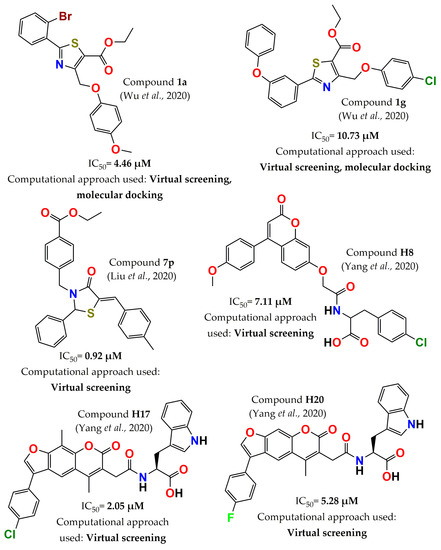In 2020, Wu and colleagues identified a series of novel PTP1B inhibitors using a virtual screening workflow, molecular docking, and ADMET (absorption, distribution, metabolism, excretion, and toxicity) strategy. Compound ZINC39276654 was selected from the ZINC database by virtual screening approach to generate one thousand molecule derivatives. Subsequently, one hundred generated derivatives were selected among the top-scored molecules and redocked into the PTP1B active site to choose the top ten compounds (1a–1j) to evaluate the inhibitory capacity. Compound 1a (ethyl 2-(2-bromophenyl)-4-((4-methoxyphenoxy)methyl)thiazole-5-carboxylate, Figure 10) exhibited the best inhibitory potency (IC50 = 4.46 µM) and acceptable predicted pharmaceutical properties. This molecule was selective for PTP1B over other phosphatases—3 times for TCPTP (IC50 = 12.28 µM) and >22 times for the rest—Src homology region 2 domain-containing phosphatase 1 (SHP1), megakaryocyte protein tyrosine phosphatase 2), CDC25B (M-phase-inducer phosphatase 2 (MEG2), and LAR. However, compound 1g (ethyl 4-((4-chlorophenoxy)methyl)-2-(3-phenoxyphenyl)thiazole-5-carboxylate, Figure 10) showed the strongest selectivity for PTP1B over the TCPTP (>9 times, IC50 = >100 µM) [106]. In the same year, a series of seventeen novel 4-thiazolinone derivatives that shared the scaffold of compound ZINC99459 was discovered by virtual screening. ADMET prediction (including human intestinal absorption, blood–brain barrier, plasma protein binding, aqueous solubility, cytochrome P450 2D6 binding, and toxicity) indicated that these compounds showed good drug-likeness properties. Then, in vitro enzyme inhibitory activity was determined on PTP1B and other phosphatases. Compound 7p (Figure 10) was identified as the most potent (IC50 = 0.92 µM) and selective inhibitor, >100 times (IC50 = >100 µM) against TCPTP, SHP2, CDC25B, LAR, and MEG2 and at least 24 times against SHP1 [107]. Another effort to find PTP1B inhibitors via computational tools was a work reported by Yang and colleagues. A natural product library of approximately 122,000 compounds was screened by different in silico filters, such as the 3D-QSAR model, 2D fingerprint similarity, and molecular docking. The twenty-six molecules prioritized by virtual screening were explored to determine their inhibition against PTP1B. The most active compounds, coumarin derivatives, showed an IC50 in the micromolar range. Among them, nine molecules were further evaluated against several phosphatases showing selective inhibition for PTP1B over the other phosphatases, including TCPTP. The most active inhibitor was H17 (IC50 = 2.05 µM, Figure 10), but it was not selective (inhibitory activity on TCPTP: 73.5% at 10 µM). The most selective compounds were H8 and H20 (Figure 10), with a selectivity of approximately 10 times (inhibitory activity < 10% at 10 µM) with respect to TCPTP, CD45, LAR, and VHR phosphatases [108].