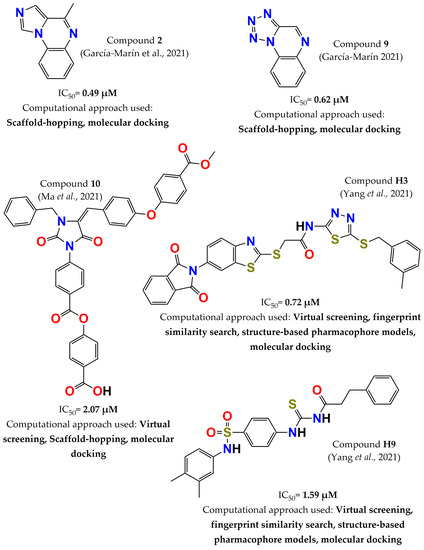 In 2021, the scaffold-hopping approach was employed to optimize the structure of compound 1 based on the replacement of the pyrrole ring by azoles. The new compounds showed better drug-like properties than compound 1 according to the results obtained by means of in silico tools. Most molecules showed good inhibitory activity within the IC50 range of 0.46–2.17 µM. Among these compounds, compound 2 (4-methylimidazo[1,2-a]quinoxaline, IC50 = 0.49, Figure 11) and compound 9 (tetrazolo[1,5-a]quinoxaline, IC50 = 0.62, Figure 11) displayed the highest potency. Additionally, selectivity evaluation of these compounds against TCPTP showed that the most selective was compound 2 (two times, inhibitory activity on TCPTP: 44% at 1 µM). This molecule also increased glucose uptake by 15% relative to control cells in phenotypic models [109]. Ma and colleagues discovered imidazolidine-2,4-dione derivatives as PTP1B inhibitors with structural diversity using virtual screening, scaffold hopping, ADMET prediction, and molecular docking. First, the compound CHEMBL213560, obtained by virtual screening, was optimized using the scaffold-hopping method. The designed compounds, with good ADMET results, were used to develop a molecular docking analysis. Fifteen compounds with high scores for PTP1B protein were selected to evaluate their biological activity. These molecules were assessed against PTP1B, Src homology region 2 domain-containing phosphatase 2 (SHP2), and LAR; compound 10 ((E)-4-(methoxycarbonyl)benzyl 4-((3-benzyl-4-(4-((4-(methoxycarbonyl)benzyl)oxy)benzylidene)-2,5-dioxoimidazolidin-1-yl)methyl)benzoate, Figure 11) the highest PTP1B inhibition, with an IC50 of 2.07 µM. Moreover, this molecule had 10 times higher inhibitory capacity on PTP1B than SHP2 and 60 times higher than that of LAR [110]. Finally, another study of integrated virtual screening consisting of fingerprint similarity search, structure-based pharmacophore models, and molecular docking was carried out to search for potential allosteric PTP1B inhibitors from commercially available chemical libraries. Of 184,922 molecules, nine compounds were selected to be evaluated in vitro. Two compounds were the most active: H3 (IC50 = 0.72 µM, Figure 11) and H9 (IC50 = 1.59 µM, Figure 11). They were further evaluated against TCPTP and SHP2, displaying selective inhibition of PTP1B over both phosphatases (>60 times, IC50 = >100 µM) [111].