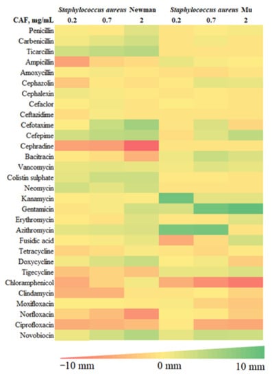 Modulatory effects of caffeine were observed for a broad range of antibiotics against both strains of S. aureus. The observed pattern of caffeine impact was generally consistent within particular antibiotic families. For penicillins, no relevant impact of caffeine was reported in S. aureus antibiotic-resistant strain Mu. For penicillin and carboxypenicillins (carbenicillin and ticarcillin), a slight caffeine-induced enhancement of antibacterial activity was observed in S. aureus Newman strain, with no such effects in ampicillins. For most cephalosporins investigated, weak inhibitory effects of caffeine were observed against both strains of S. aureus. Strong inhibition of caffeine was reported only in combination with cephradine against S. aureus Newman strain. In contrast, the activity of third- and fourth-generation cephalosporins, cefotaxime and cefepime, increased in a moderate manner, particularly in S. aureus Newman strain. No notable impact of caffeine was observed for nonribosomal peptide antibiotics bacitracin, vancomycin, and colistin. For aminoglycosides (neomycin, kanamycin, and gentamycin), macrolides (in particular azithromycin), and aminocoumarin novobiocin, a pronounced potentiation of antistaphylococcal activity was observed in the presence of caffeine. No marked modulatory action of caffeine was reported toward fusidic acid and tetracyclines. In contrast, caffeine considerably inhibited the antibacterial activity of chloramphenicol, clindamycin, and fluoroquinolones moxifloxacin, norfloxacin, and ciprofloxacin.