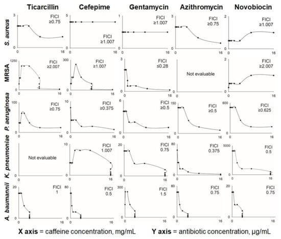 The results of the checkerboard experiments are shown in Table 2. For a graphical representation of obtained results, expressed as isobolograms, refer to Figure 2 (for full-size isobolograms, see Figures S1–S5). For the vast majority of antibiotic-caffeine combinations, an enhancement of antibacterial activity was reported regardless of the pathogen tested. Although additive and synergistic effects were observed most frequently, antagonistic interactions were also observed when caffeine was applied with the following antibiotics: i. ticarcillin towards S. aureus MRSA 43300 (at caffeine concentrations up to 8 mg/mL); ii. cefepime towards S. aureus MRSA 43300 and K. pneumoniae ATCC 700603; and iii. novobiocin towards S. aureus ATCC 27853 and MRSA 43300. No indication of interactions (neither positive nor negative) was found only for cefepime and gentamycin applied simultaneously with caffeine towards S. aureus ATCC 27853 (MSSA). In most cases, the addition of relatively low concentrations of caffeine (0.5 to 8 mg/mL) resulted in halving the MIC values of tested antibiotics. Caffeine at concentrations of 0.25 mg/mL caused a 2-fold drop in MIC value of cefepime towards P. aeruginosa and of azithromycin towards K. pneumoniae. Similarly, 0.5 mg/mL of caffeine halved the MIC of cefepime towards A. baumannii. Subinhibitory doses of caffeine led to as high as 16-fold decreases in MIC values of ticarcillin, gentamycin, and cefepime for S. aureus MRSA strain, azithromycin for K. pneumoniae, and 8-fold MIC decreases in cefepime and azithromycin for both P. aeruginosa and A. baumannii. Antagonistic effects of caffeine (with an increase in MIC of 2- to 4-fold) were reported for its combination with novobiocin for both S. aureus strains, with cefepime for K. pneumoniae, and with gentamycin for A. baumannii.