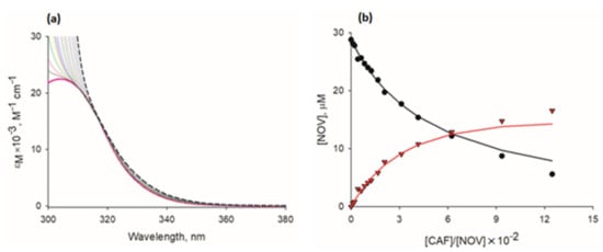 Spectrophotometric analysis of interactions of novobiocin with caffeine. (a) Molar extinction coefficient (εM) spectra of novobiocin (initial concentration, 28.8 µM) titrated with caffeine (concentration range, 0.3–32.7 mM); spectrum of novobiocin in its free form is marked in bold red. Theoretical spectrum of novobiocin complexed with caffeine (determined by extrapolation of spectra of novobiocin-caffeine mixtures to the concentration ratio of novobiocin to caffeine tending to 0) is marked with black dashed lines. (b) Comparison of experimental and theoretical (model-based) concentrations in novobiocin-caffeine mixtures analyzed spectrophotometrically. Points represent concentrations of novobiocin in a free form (circles) and novobiocin in the complex with caffeine (triangles), calculated using two-component decomposition of mixture spectra. Lines represent concentrations of novobiocin in a free form (black line) and novobiocin in a complex with caffeine (red line), calculated using statistical-thermodynamical model of mixed aggregation [30] with KAC ± standard error value of 30.51 M−1 ± 1.72 M−1. CAF, caffeine; NOV, novobiocin.