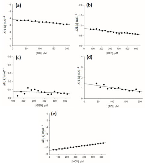 Thermal effects of the antibiotic-caffeine complex formation using isothermal titration calorimetry. Determination of enthalpy change (ΔH, kJ mol−1) values for antibiotic-caffeine interactions. Net heat of antibiotic-xanthine interactions after each titration step per mole of titrant added (corrected for heats of buffer-to-caffeine and antibiotic-to-buffer titrations; see Figure S7 for thermograms) are shown as points. (a) ticarcillin (TIC)-caffeine interaction; (b) cefepime (CEF)-caffene interaction; (c) gentamycin (GEN)-caffeine interaction; (d) azithromycin (AZI)-caffeine interaction; and (e) novobiocin (NOV)-caffeine interaction.