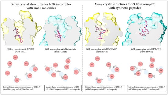 Resolved structures of the δOR in complex with small molecules and peptides. Schematic depiction of the small molecule agonist DPI-287 and antagonist naltrindole and the peptide agonist KGCHM07 and antagonist DIPP-NH2 bound to the δOR (Top panels; active-like structures in yellow and inactive structures in sea green). The difference in TM domain positions between the antagonist- and agonist-bound structures (Lower panels; antagonist-bound in grey and agonist bound in hot pink). TM domain positions produced using the structure comparison tool from GPCRdb.