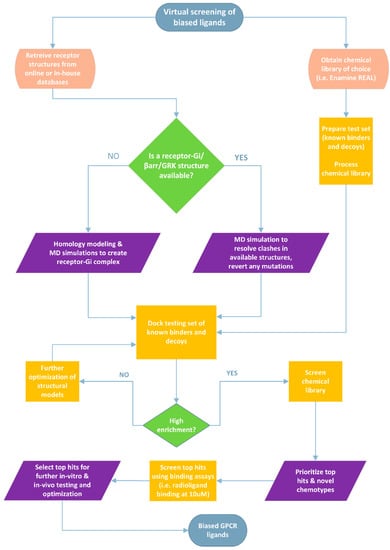 Proposed workflow for screening large chemical libraries to identify G-protein biased agonists at the δOR and other GPCRs. A similar workflow could be applied to identify GRK- or β-arrestin-biased small molecules given that high-quality crystal or cryo-EM structures are available. In cases where distinct interactions or sub-pockets specific to biased agonists or in cases where we know that an allosteric site/pocket could lead to biased effects, we could restrict ligand docking to that specific site to screen a given chemical library. The most accurate way to confirm such interactions would be to resolve high-quality structures and/or perform mutagenesis studies. Alternatively, enhanced sampling computational modeling to model receptor-effector complexes could be useful if computational cost is not a limiting factor.