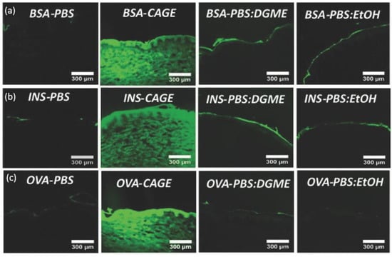 In vitro skin penetration of (a) FITC-BSA, (b) FITC-Insulin, and (c) FITC-OVA in PBS, CAGE, 50:50 (v/v) PBS/DGME, and 50:50 (v/v) PBS/ethanol, respectively. BSA—bovine serum albumin; INS—insulin; OVA—ovalbumin; PBS—phosphate buffered saline; DGME—diethylene glycol monoethyl ether (reproduced with permission from Banerjee et al., Advanced Healthcare Materials; adapted with permission from Ref.[55]. Copyright 2017 Wiley).