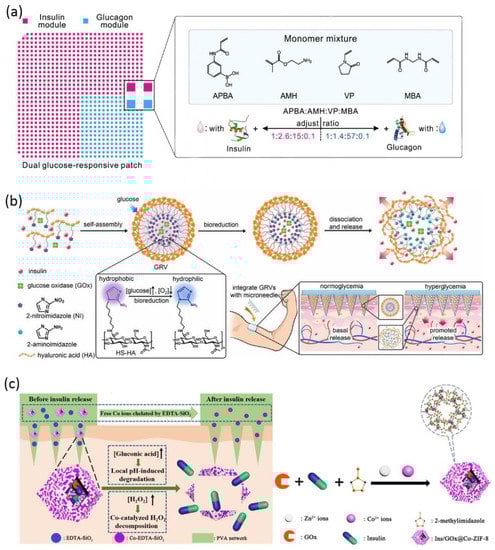 Schematic of glucose-responsive insulin delivery microneedles: (a) A dual-module microneedle patch to separately encapsulate insulin and glucagon. The two modules comprise different ratios of key monomers, synergistically responding to both hyperglycemic and hypoglycemic states (reproduced with permission from Wang et al., Proceedings of the National Academy of Sciences of the United States of America; published by National Academy of Sciences, 2020) [174]; (b) fast-responsive MN patch loaded with hypoxia-sensitive hyaluronic acid (HS-HA) vesicles containing insulin and GOx. In localized hypoxic environment, the hydrophobic 2-nitroimidazole groups of HS-HA are reduced to hydrophilic 2-aminoimdazole, leading to the dissociation of vesicles and subsequent release of insulin (reproduced with permission from Yu et al., Proceedings of the National Academy of Sciences of the United States of America; published by National Academy of Sciences, 2015) [179]; (c) the insulin and glucose oxidase are encapsulated in metal–organic framework and further loaded into the microneedle matrix. The low pH induced by glucose oxidation leads to framework degradation and insulin release. The preloaded Co2+ catalyzes the decomposition of the byproduct H2O2. The excessive Co2+ is chelated by EDTA-SiO2 nanoparticles in the microneedle matrix (reproduced with permission from Yang et al., ACS Applied Materials & Interfaces; published by ACS, 2020) [176].
