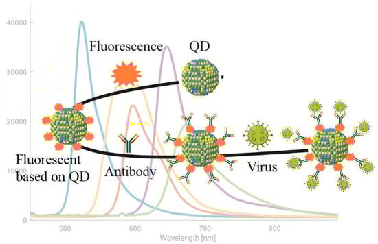 The change in the fluorescent signal of the probe is measured to detect the virus. However, photo quenching and photobleaching usually occur with fluorescent molecules under high-power laser irradiation or long-term illumination. Therefore, an ultrasensitive fluorescent sensor must be constructed using suitable fluorescent molecules with adjustable laser power [57]. Compared to commercial fluorescent molecules, colloidal semiconductor nanomaterials called QDs have optical properties such as adjustable emission wavelength, high quantum efficiency, and excellent anti-photovoltaic ability [55,58]. Therefore, nanoparticle doping with semiconductor QDs or lanthanide chelates is involved in designing fluorescence-based assays [59]. Devices to detect pathogenic organisms using natural biocompatible substances with a proper substrate are called nanomaterials-based biosensors. Usually, a suitable data processing system is connected to these platforms [60]. One of the reasons that lead to the bioconjugation of QDs to the biosensor structure is a growing interest in detecting viruses by utilizing nanomaterials-based biosensors. Low cytotoxicity, superior biocompatibility, high photostability, and accessible surface modification are among the amazing properties of fluorescent QDs [61,62,63].