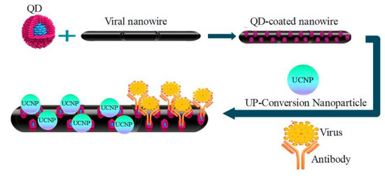 When forming heterostructures in small dimensions, nanowires (NWs), including QD, offer several degrees of freedom thanks to their morphology and size [67]. Nanowires are the best option for creating robust, sensitive, and selective electrical detectors for bio-bonding purposes. Through susceptible and direct electrical methods, devices containing nanowires are best used for optical excitation, electron transfer, and as carriers as a means of determining the biological and chemical species [68]. To study the environment and in-body sensing, the main factor in developing remote nanobiosensors is the delicate nature of nanowires [69]. Nanobiosensing devices made of nanowires or fibers at the nanoscopic scale are called nanowire-based sensors, which are covered by bionanowires (macromolecules), including proteins, fibrin, and DNA molecules. The current flows in nanowires are very close to the surface, where the current flow in any one-dimensional system is susceptible to minor disturbances [70,71]. The diameter of these nanowires is the size of biological macromolecules. Unlabeled direct electrical reading is achieved through the ability to attach analytes to the surface and combine the tunable conducting properties of semiconductor nanowires [72]. These sensors operate on the principle of ion-selective field-effect transistors and rely on the interaction of external charges with carriers in the nearby semiconductor, which increases sensitivity to low ionic strength. QD nanowires formed via genetically engineered non-toxic virus will be used as energy channels. These QD-coated viral nanowires will be biologically conjugated to a light-harvesting antenna (up-conversion nanoparticles) at one end and QD receivers at the other, forming biologically-templated energy circuits as depicted in Figure 4 [73].