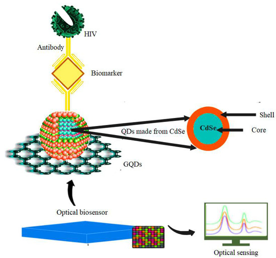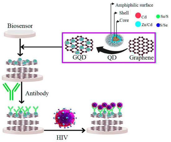 The presence of several functional groups on the GQDs surface, like other graphene-based nanomaterials, allows multifaceted conjugation and conversion into ideal materials to occur for drug delivery and target-specific HIV inhibition [3,82]. Even though the study of graphene-based antivirals is still in its infancy, the QD of graphene has shown the potential to revolutionize the future of anti-HIV detection due to their tunable photoluminescence excellent colloidal stability, and acceptable biocompatibility (Figure 5) [83]. To detect HBV-DNA, Xiang et al. examined a very simple and efficient GQD-based electrochemical biosensor that acted as an electrode material. They used a safe and straightforward pyrolysis process involving citric acid to synthesize GQDs. The results showed that due to the addition of HBV-DNA, electrostatic repulsion removal caused an increase in the low values of the current peak. This increase is also due to the presence of pDNA on the surface of the modified electrode. In a focus-dependent approach where HBV-DNA-pDNA duplexes are present, this carbon-based electrochemical DNA biosensors strategy will lead to a superb linear diagnosis range between 10–500 nm and the best detection limit of 1 nm [84].