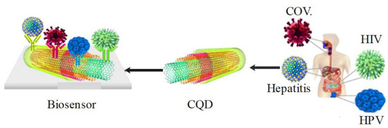 In 1962, Clark proposed the concept of a CNT-based biosensor to describe an enzymatic electrode [85]. The biologically sensitive transducer elements are parts of a CNT-based biosensor compound. CNT acts as a biologically sensitive element with bioreceptors such as proteins, polynucleotides, and even entire biological tissues [86]. CNTs have many applications in various fields and have unique electronic, mechanical, structural, and optical properties [87]. Although spherical carbon nanomaterials have attracted attention in medicine due to their immunogenicity, biocompatibility, uniform surface chemistry, and simple geometry, their importance has decreased due to some disadvantages such as poor water solubility, lack of biodegradability, toxicity concerns, and low pK [88,89]. Additionally, since 1991, carbon nanotubes have been introduced as an excellent alternative due to their chemical stability, high heterogeneous electron transfer and long-range, high electrical conductivity, high surface area, excellent biocompatibility, and good mechanical strength in nanobiosensors [3,90,91]. Among the advantages of carbon nanotubes identified in the past decade are the fast heterogeneity electron transfer, long-range electron transfers, and high surface area, which have led to widespread use. Wiriyachaiporn et al. presented a carbon nanotagger-based lateral flow method to diagnose the influenza A virus [92]. Additionally, Li et al. used a diaminoazobenzene and multiwalled carbon nanotube-modified glassy carbon electrode to detect HBV through the electrochemical approach [93]. Since CNTs have low solubility in water and have difficulty in providing strong fluorescence in the visible region, this greatly limits their application. Therefore, CQDs as new nanomaterials based on zero-dimensional carbon, which are known for their small size and relatively strong fluorescence properties, have been considered in various applications such as biomedicine [94]. CQDs are small fluorescent carbon nanoparticles with a size that is less than 10 nm [48]. Photostability, light bleaching resistance, and nonscintillation are CQDs’ features, and QD carbon has excellent fluorescence properties compared to traditional fluorescent dyes. CQDs are safer and non-toxic at cellular and animal levels [90,91,95] and are desirable options for nanomedical applications due to the absence of visible signs of toxicity in animals, excellent water dispersion, and an average diameter of less than 10 nm [96,97]. Due to good biocompatibility, CQDs can be used as fluorescent probes for biosensing [98,99]. PL properties, small size, biocompatibility, chemically inert structure, high-temperature stability, and accessible functionalization routes are the unique features of CQDs observed in recent years [100,101]. QD carbon can be synthesized through several inexpensive and simple methods, and in vivo tracking is possible due to its excellent optical properties. Recently, suitable scaffolds that interfere with the entry of viruses into cells have been discovered for CQDs, as depicted in Figure 6 [102]. As a type of carbon nanostructure, CQDs have attractive and ideal advantages for optical sensors, including low cost-effectiveness, high water solubility, simple manufacturing methods, excellent adjustable optical properties, and chemical inertness [80,103,104]. The quantum efficiency of CQDs is low, but they have many advantages.