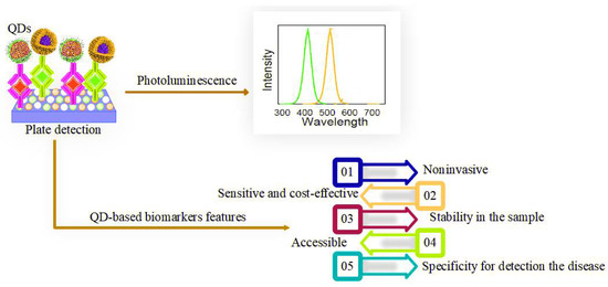 Although the term biomarker is relatively new, it has been used extensively in clinical research and detection [13,14]. In addition to expanding methods for detecting infectious diseases, there is an increasing need to find biomarkers based on QDs with higher sensitivity and the ability to determine the extent and course of disease activity. The features of quantum dot-based biomarkers include being a non-invasive, sensitive, and cost-effective method, high stability in the sample, high specificity for detection of disease, identification before symptoms of viral diseases appear, as well as the relevance in citing and translating from animal models to humans [15]. The first glimpse of the vast potential of quantum dot-based biomarkers as probes for studying biological systems suggests that quantum dot-based biomarkers can be dissolved in water and conjugated with biological molecules. QD-based biomarkers have advantages over organic dyes and fluorescent proteins, such as multicolor fluorescence emission, improved brightness, and resistance to light bleaching. These advantages could improve biological detection and imaging sensitivity by at least one to two orders of magnitude [16].