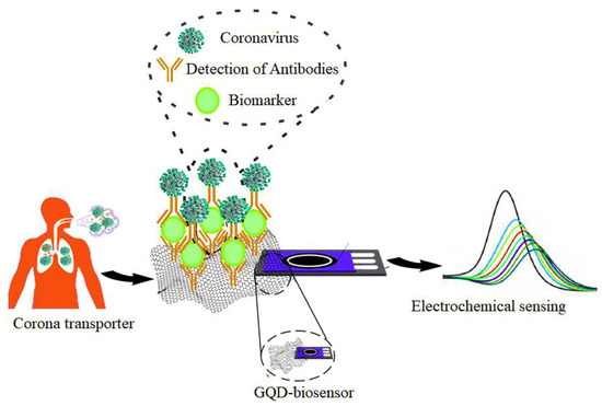 QDs effectively act as a biomarker and potential virus targeting agent [117]. According to the researchers, graphene-based QD biomarkers and their varieties can diagnose coronavirus; thus, they have many potential applications that can ensure the fight against COVID-19 makes significant progress (Figure 8). To target the spike protein on the coronavirus, the researchers have developed experiments combining graphene sheets that are more than 1000 times thinner than postage stamps (thickness of 0.34 nm) with antibodies. Subsequently, measurements of the atomic surface vibrations of these graphene sheets were performed when they were exposed to COVID-positive and COVID-negative samples in artificial saliva. These graphene sheets were tested in the presence of other coronaviruses such as MERS-CoV. The researchers found that the vibrations of the antibody-bound graphene sheet changed during treatment with a COVID-positive sample. However, when exposed to COVID-negative samples or other types of coronaviruses, no significant change was observed. Vibration changes were measured in less than five minutes using a Raman spectrometer. These resonant vibrations change precisely and in a quantifiable manner when a molecule such as SARS-CoV-2 interacts with graphene [122]. To identify pathogenic viruses such as SARS-CoV-2 or animal viruses that can be detected through differentiated fingerprints of their viral glycoproteins at different voltage positions, Hashemi et al. designed and reviewed a rapid electrochemical detection kit consisting of fixed screen-printing electrodes. To detect the trace of viruses in any aquatic biological environment such as blood and saliva, the researchers covered a layer of coupled graphene oxide (GO) with sensitive chemical compounds along with gold nanostars (Au NS) to activate the working electrode of the developed sensor. The results showed that this method was able to detect traces of various pathogenic viruses in about 1 min and did not require extraction and/or biomarkers to identify the target viruses. Based on the results obtained for the nanosensor, the detection limit (LOD) is 1.68 × 10−22 μg mL−1, and the sensitivity is 0.0048 μAμg.mL−1. cm−2 [123].
