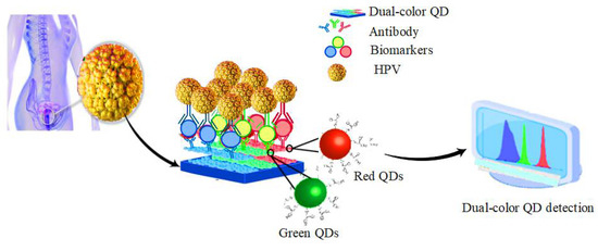 A dual-color QD detection method can simultaneously detect the co-infection of HPV infection and HIV, as depicted in Figure 10 [129]. Xue et al. used the QD in situ hybridization (ISH) in studying the association of oral squamous cell carcinoma with HPV. After comparing QDISH with conventional ISH, the presence of high-risk HPV16/18 was detected. Thus, the results suggest that QD may be an effective method for detecting HPV infection and HPV-related oral squamous cell carcinoma [130]. Piao et al. also investigated different types of fluorescent nanomaterials such as metal nanoparticles, QDs, and fluorophorodized silica nanoparticles to detect human papillomavirus DNA [131]. Nejdl et al. analyzed the interactions between blue and yellow fluorescent CdS QDs to decipher the HPV-16 oncogene E6. The results showed that yellow-low fluorescent CdS-QDs showed a higher affinity for DNA (E6 HPV-16) than blue dyes [132].