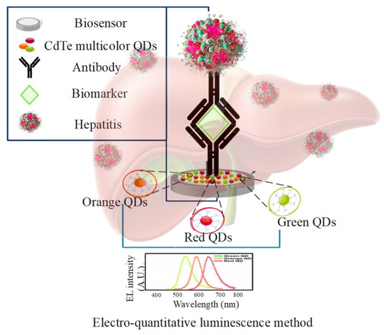The electro-quantitative luminescence method is also used to detect hepatitis C and hepatitis B virus using CdTe multicolor QDs (Figure 11). Ideally, the detection limit for hepatitis B virus is 0.082 picomoles per liter and for hepatitis C virus is 1.341 picomoles per liter. The DNA sensor has the appropriate specificity, sensitivity, stability, and reproducibility. This sensor is used to detect hepatitis C virus target RNA and HBV target DNA in humans, and the results have been evaluated to be satisfactory [135]. In clinical diagnosis, sensitive and convenient detection of HBV gene mutations is essential. According to Zhang et al., to detect mutations in the HBV gene in real serum samples of patients with chronic hepatitis B (CHB) who had received antiviral therapy with lamivudine or telbivudine, a sensitive, low-cost, and convenient QDs-mediated fluorescent method was developed [136]. Chowdhury et al. investigated an electrochemical sensor based on enhanced QDs to detect the hepatitis E virus (HEV). The results showed that the proposed sensor based on QDs could pave the way for developing robust and powerful assay methods for detecting HEV [137]. Liu et al. investigated a protein array based on QDs encoded microbes for the diagnosis of hepatitis C virus. To evaluate the protein array based on QDs encoded microbes, 120 HCV-positive and 50 HCV-negative samples were tested and compared with the results of the recombinant immunoblot assay (RIBA) as the gold standard [138]. Wang et al. investigated the highly efficient production of QD barcodes at multiple scales to diagnose multiplex hepatitis B. Five HBV indicators were selected as diagnostic targets to examine the feasibility of QD barcodes in high-performance detection. The results showed that these QD barcodes are very useful for the simultaneous and selective detection of many different biomolecular targets [139].
