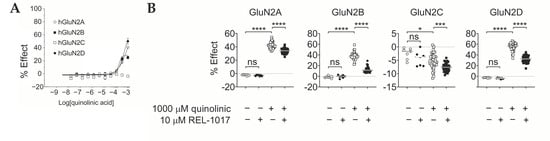 (A) Quinolinic acid (QA) is a subtype-selective N-methyl-D-aspartate receptor (NMDAR) partial agonist. QA concentration–response curve (CRC) was performed in the absence of L-glutamate by fluorometric imaging plate reader (FLIPR) calcium assay, using the Chinese hamster ovary (CHO) cell lines expressing the indicated heterodimeric NMDAR. QA, at the two highest tested concentrations, 333 µM and 1000 µM, increased intracellular calcium ([Ca2+]in) in GluN2A-, GluN2B-, and GluN2D-expressing cell lines, with estimated an EC50 of 850 µM, 170 µM, and 520 µM for GluN2A, GluN2B, and GluN2D receptors, respectively. Estimated maximal asymptotic response was 75%, 28%, and 71% of that evoked by 10 μM L-glutamate for GluN2A, GluN2B, and GluN2D receptors, respectively. GluN2C-expressing cells were not activated by any tested concentration of QA. Data are mean ± standard error of the mean (SEM), n = 6 wells per group, and were fitted using four-parametric logistic equation with GraphPad Prism v8.0. (B) It was shown that 10 µM REL-1017 reduced calcium entry in the presence of 1000 μM QA. QA 1000 μM increased [Ca2+]in up to 41%, 37%, and 55% in GluN2A, GluN2B, and GluN2D NMDAR subtypes, respectively. In addition, 10 μM REL-1017 significantly (p < 0.0001) decreased these values to 34%, 12%, and 32% in GluN1-GluN2A, GluN1-GluN2B, and GluN1-GluN2D NMDAR subtypes, respectively. In the GluN1-GluN2C cell line, [Ca2+]in was −5.5% and −7.6% after 1000 μM QA and 1000 μM QA plus 10 μM REL-1017, suggesting a reduction in baseline NMDAR-mediated [Ca2+]in, possibly due to an endogenous low-level L-glutamate release by the CHO cell line. Data (n = 7 wells for buffer and REL-1017 groups, n = 42 wells for the remaining groups) are shown as scatter dot plot, and median value is indicated. **** is p < 0.0001; *** is p < 0.001; * is p < 0.05; ns is not statistically significant.