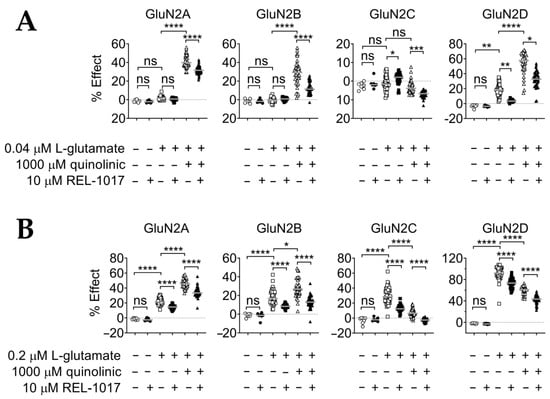 Considering that sub-micromolar concentrations of ambient glutamate tonically activate NMDARs in select cell types and/or brain regions, physiologically and pathologically [54,56,57,58,59], our observed QA potentiating effect of sub-saturating L-glutamate concentrations may help explain the quinolinic-induced neurotoxicity by GluN1-GluN2A, GluN1-GluN2B, or GluN1-GluN2D NMDAR subtype hyperactivity (Figure 2). With regard to the GluN1-GluN2D subtypes, potentiation was evident only at 0.04 μM and not at 0.2 μM, suggesting that QA-induced calcium dysregulation at this receptor subtype may be preferentially relevant in the presence of very low ambient glutamate. As ambient glutamate in physiological states is expected to be negligible, the importance of this receptor subtype as the most vulnerable target in the pathophysiology of disorders triggered or maintained by excess ambient glutamate, even at very low concentrations, may deserve more attention. Of note, this receptor subtype is the preferential target for REL-1017 in the presence of physiological magnesium [60]. Finally, the effect of REL-1017 on the reduction in [Ca2+]in induced by QA, alone (Figure 1) or in combination with sub-saturating L-glutamate concentrations (Figure 2), suggests potential neuroprotective effects when QA might overstimulate NMDARs directly, alone and in the presence of low-concentration ambient glutamate.