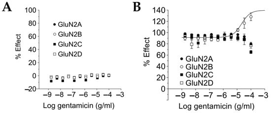 The effects of gentamicin on NMDARs in our intracellular calcium assay confirm and extend the data obtained through electrophysiological recordings from transduced oocytes expressing heterodimeric NMDARs [48,49,50]. In particular, we confirmed the selectivity of gentamicin for the GluN1-GluN2B receptor at 10 µM L-glutamate concentration (Figure 3), with an EC50 of 21 µg/mL (30.8 µM). Exposure to 100 µg/mL (146.7 µM) gentamicin in addition to 10 µM L-glutamate induced a [Ca2+]in increase of 128% of the previously measured plateau from saturating L-glutamate concentrations alone. This finding is in agreement with the 38 µM EC50 and 132% plateau maximal response with 300 µM gentamicin described in oocytes [48]. In addition, we observed a potentiation by 10 µg/mL gentamicin of the sub-saturating 0.04 µM glutamate effect on GluN1-GluN2A, GluN1-GluN2B, and GluN1-GluN2D NMDAR subtypes (Figure 4A), while potentiation of a slightly higher but still sub-saturating 0.2 µM glutamate effect was observed only with GluN1-GluN2A NMDAR subtypes (Figure 4B).