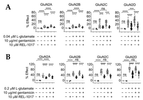 (A) Gentamicin was a positive modulator at GluN1-GluN2A, GluN1-GluN2B, and GluN1-GluN2D subtypes, in the presence of 0.04 μM L-glutamate, and REL-1017 reduced [Ca2+]in in the presence of 0.04 μM L-glutamate, with or without 10 μM gentamicin, in all tested NMDARs. In addition, 10 μM gentamicin was tested in combination with 0.04 μM L-glutamate; 10 μM gentamicin significantly increased [Ca2+]in in all cell lines expressing GluN1-GluN2A, GluN1-GluN2B, or GluN1-GluN2D subtypes (p < 0.0001, p < 0.0001, and p < 0.001, respectively). REL-1017 significantly decreased [Ca2+]in elicited by 0.04 μM L-glutamate and 0.04 μM L-glutamate plus 10 μM gentamicin in all cell lines (p < 0.0001 in all cell lines and with p < 0.001 in GluN1-GluN2C). Data (n = 7 wells for buffer and REL-1017 groups, n = 30 wells for the remaining groups) are shown as scatter dot plot, and median value is indicated. (B) Gentamicin was a positive modulator at the GluN1-GluN2A NMDAR subtype, in the presence of 0.2 μM L-glutamate, and REL-1017 reduced [Ca2+]in in the presence of 0.2 μM L-glutamate, with or without 10 μM gentamicin, in all cell lines. Furthermore, 10 μM gentamicin was tested in combination with 0.2 μM L-glutamate; 10 μM gentamicin significantly (p < 0.0001) increased [Ca2+]in only in cell lines expressing GluN1-GluN2A subtypes. REL-1017 significantly (p < 0.0001) decreased [Ca2+]in elicited by 0.2 μM L-glutamate and 0.2 μM L-glutamate plus 10 μM gentamicin in all cell lines. Data (n = 7 wells for buffer and REL-1017 groups, n = 30 wells for the remaining groups) are shown as scatter dot plot, and median value is indicated. **** is p < 0.0001; *** is p < 0.001; ns, not statistically significant.