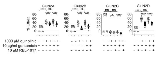 The 1000 μM QA was a partial agonist at GluN1-GluN2A, GluN1-GluN2B, GluN1-GluN2C, or GluN1-GluN2D subtypes and 10 µg/mL gentamicin did not increase [Ca2+]in in the presence of 1000 μM QA. REL-1017 significantly decreased [Ca2+]in elicited by 1000 μM QA or 1000 μM QA plus 10 μM gentamicin. Data (n = 7 wells for buffer and REL-1017 groups, n = 42 wells for the remaining groups) are shown as scatter dot plot, and median value is indicated. **** is p < 0.0001; * is p < 0.05; ns, not statistically significant.