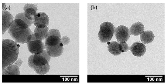 The final materials were characterized by transmission electron microscopy (TEM) (Figure 1). The micrographs were analyzed using ImageJ® software in order to determine the morphology and particle size. As can be seen in Figure 1, the nanoparticles showed an oval morphology with pores crossing the particles. The nanoparticles had a mean size of 97.23 ± 19.75 nm and 95.08 ± 15.93 nm, for NT-Ag and NT-Ag@Ph, respectively (for particle size distributions, see Figure S1 of SI). Moreover, as can be observed in Figure 1, the morphology and particle sizes were similar between the final materials; thus, it can be deduced that the encapsulation in the porous system of phenytoin sodium did not influence in the morphology and the particle size of the silica nanoparticles. Lastly, spherical nanoparticles were observed adhered to MSNs with an average size of 15–20 nm that could be compatible with Ag nanoparticles.