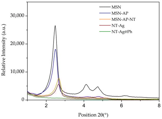 The starting material MSN and the corresponding functionalized materials were characterized by powder X-ray diffraction (Figure 2 and Table S1). All materials showed a high-intensity diffraction peak at a 2θ of ca. 2.47° assigned to the (100) Miller plane, which confirmed the mesoscopic order of the materials attributed to their hexagonal porous structure promoted by the use of CTAB as surfactant. Additionally, two signals were observed around 2θ 4.1° and 4.7°, corresponding to the (110) and (200) Miller planes, respectively. The intensity of the (100) peak decreased after the different functionalization reactions due to the partial blocking of the scattering points of the porous system caused by the incorporation of the organic and/or metallic fragments in the system [23]. Furthermore, the right shift of the signal at 2.47° upon functionalization with NT and incorporation of Ag was indicative of a slight decrease in the pore size [24,25]. In addition, as a consequence of the efficient functionalization, in the modified systems, a quenching of signals at 2θ values of 4.1° and 4.7° (which appeared in the unmodified MSN) was observed in the functionalized systems. In addition, the presence of AgCl nanoparticles and the correct encapsulation of Ph in the pores of MSN were confirmed by large-angle diffractograms, (Figure S4 in SI) of NT-Ag and NT-Ag@Ph.
