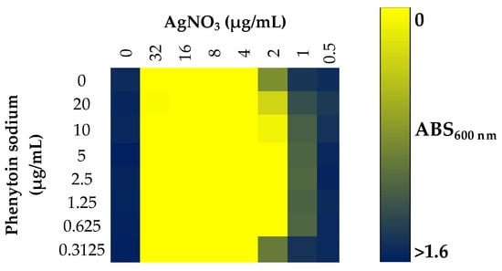 Briefly, using a 96-well plate, a twofold dilution of freshly prepared AgNO3 and phenytoin sodium at different concentrations in MHB was dispensed in a checkerboard array and inoculated with 105 CFU/mL of the bacterial suspension. One well with no antibiotics was used as the positive control. It was incubated for 18 h at 37 °C and 5% CO2; after incubation, bacterial viability was determined by the addition of 20 µL of 5 mg/mL of 3-(4,5-dimethylthiazol-2-yl)-2,5-diphenyltetrazolium bromide (MTT) (Sigma Aldrich, Merck, Darmstadt, Germany) and incubating for 1 h at 37 °C and 5% CO2. This experiment was performed in duplicate, and the mean was presented.