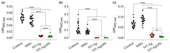 Inhibition of biofilm development of ATCC27853 (a), PA8 (b), and PA13 (c) in the presence of MSN (as a control, black), NT-Ag (garnet), and NT-Ag@Ph (green) at 125 µg/mL. ** p < 0.01, **** p < 0.0001 according to Mann–Whitney and Kruskal–Wallis tests.
