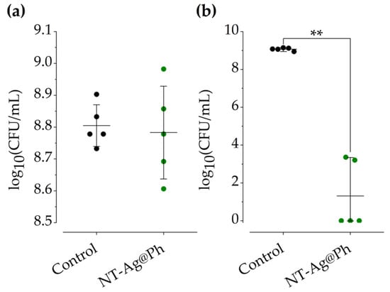 The effect of NT-Ag@Ph against ATCC27853 wound-like medium at 125 µg/mL (a) and 2 mg/mL (b). The control (black) and NT-Ag@Ph (green) are shown. ** p < 0.01 for Mann–Whitney test.