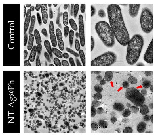 The bactericidal mechanism of NT-Ag@Ph was analyzed by means of a thoughtful analysis of TEM images of P. aeruginosa ATCC27853 strain culture, acquired in both the absence (control) and the presence of 2 mg/mL (2 × MBC) of NT-Ag@Ph (Figure 6).