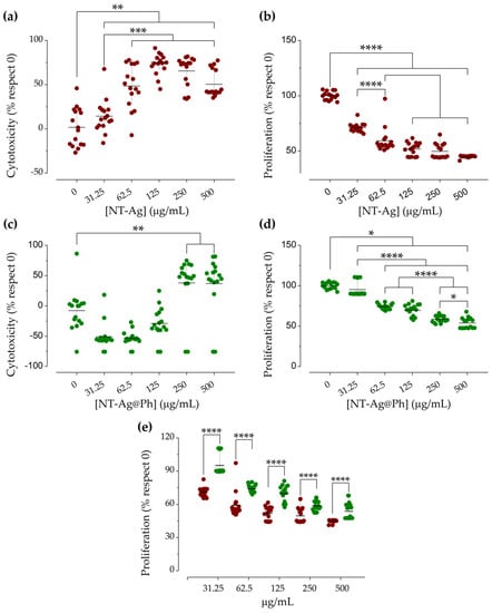 Cytotoxicity of NT-Ag (a) and NT-Ag@Ph (c), and fibroblastic proliferation of NT-Ag (b) and NT-Ag@Ph (d). Comparative proliferation (e) of unloaded (garnet) and loaded (green) material with phenytoin sodium. *, **, ***, **** p < 0.05, 0.01, 0.001, and 0.0001 for Mann–Whitney and Kruskal–Wallis tests.