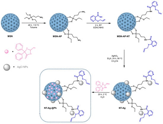 MSN were functionalized with 3-aminopropyltriethoxysilane to give MSN-AP (Scheme 1). Subsequently, these amino-functionalized materials were also treated with 10% 2-allythionicotinic acid using an EDAC/NHS coupling reaction to give MSN-AP-NT (Scheme 1). After functionalization with NT, the formation of AgCl nanoparticles was achieved by the reaction of the material with AgNO3 under reflux and darkness, to obtain the NT-Ag material (Scheme 1). Finally, the NT-Ag material was loaded with phenytoin sodium in water and at low temperature to achieve the final material NT-Ag@Ph (Scheme 1).