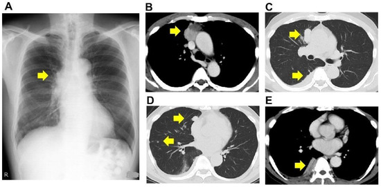 Radiological findings. Plain radiograph (A) and computed tomography (B–E). The computed tomography revealed a tumor between the anterior mediastinum and the right lung upper lobe (B,C), multiple nodular shadows along the right pleura (D), and pleural effusion (E). Arrows indicate the lesion.