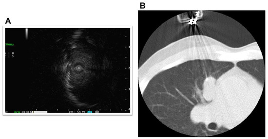 Bronchoscopy and computed tomography-guided biopsy. A thin bronchoscope, endobronchial ultrasonography, and a guide sheath were used during the bronchoscopy (A). Biopsy was performed under computed tomography guidance (B).