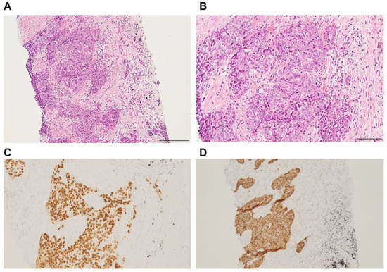 The primary lesion was located between the mediastinum and the right lung lobe, thus, it was difficult to distinguish whether the tumor originated from the mediastinum or the lungs. A thin bronchoscope with endobronchial ultrasonography and a guide sheath was inserted into the right B3biαx bronchial branch, and a biopsy within the tumor was performed. However, the histopathological study showed no diagnostic findings. CT-guided needle biopsy (CTNB) was then performed (Figure 2A,B). An expert pathologist revised the tissue specimen sampled by CTNB. The pathology report revealed a solid tumor with malignant squamous cells and scarring tissue and positive immunostaining for p40 and CK5/6. The pathological diagnosis was non-keratinized squamous cell carcinoma (Figure 3A–D). The differential diagnosis between thymic carcinoma and primary lung cancer was difficult based on imaging and histopathological findings. A PET/CT scan showed a primary tumor with high 18F-fluorodeoxyglucose accumulation, a maximum standardized uptake value of 10.95, and multiple nodules with a maximum standardized uptake value of 7.08 in the right lung interlobar region and pleura. The diagnosis was cancerous pleural dissemination (Figure 4A–F). The tumor was negative for epidermal growth factor receptor (EGFR) gene mutation, anaplastic lymphoma kinase (ALK) fusion gene, and the proto-oncogene tyrosine-protein kinase (ROS1). The degree of tumor PD-L1 (22C3) staining was low (5–10%). The tumor was considered unresectable.