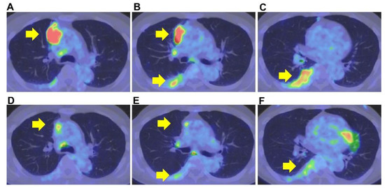 Positron emission tomography–computed tomography. Before therapy, the primary tumor’s positron emission tomography–computed tomography showed high 18F-fluorodeoxyglucose accumulation and a maximum standardized uptake value of 10.95 (A–C). After therapy, the primary tumor’s positron emission tomography–computed tomography showed a maximum standardized uptake value of 4.5 (D–F).