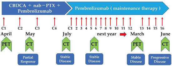 The clinical course of the patient. PET, positron emission tomography; CT, computed tomography; C, chemotherapy, CBDCA, carboplatin; PTX, paclitaxel; nab, nanoparticle albumin-bound.