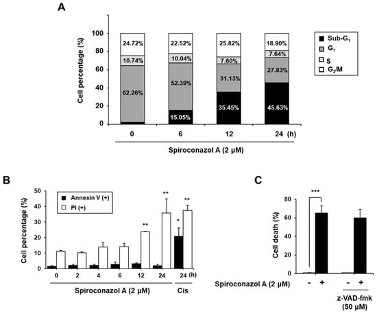 Non-apoptotic features were presented by spiroconazol A in A549 cells. (A) Cells were exposed to spiroconazol A (2 μM) and were stained with the PI solution. For detection of sub-G1, indicating cell death, cells were determined by flow cytometry. (B) After treatment with spiroconazol A (2 μM) for the indicated times, cells were stained with FITC-conjugated Annexin V and PI (Cis: cisplatin) and then detected by flow cytometry. (C) After treatment with 50 μM z-VAD-fmk (broad caspase inhibitor) for 1 h, cells were treated with spiroconazol A (2 μM) for 24 h. Cells were stained with the PI solution and then examined by flow cytometry. Experiments were repeated at least three times, and data are expressed as mean ± S.D. * p < 0.05, ** p < 0.01, and *** p < 0.001 vs. control group by the Student’s t-test.