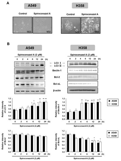 Autophagy induced by spiroconazol A in NSCLC cells. (A) Representative images showed the morphological changes in spiroconazol A (2 μM)-treated NSCLC cells using an OLYMPUS IX51 inverted microscope (Southend-on-Sea, Essex, UK). (B) Protein expression of cells exposed to 2 μM of spiroconazol A, using Western blot analysis. β-actin was utilized as an internal control. The relative optical density ratio was determined using a densitometric analysis program (Bio-Rad Quantity One® Software, version 4.6.3 (Basic), Bio-Rad Laboratories Inc., CA, USA), normalized to the internal control. * p < 0.05, ** p < 0.01 vs. untreated A549 cells, by the Student’s t-test.