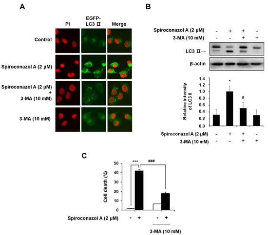 Cell death by spiroconazol A-induced autophagy. (A) The pEGFP-LC3-II-transfected A549 cells were treated with 2 μM of spiroconazol A for 24 h; immunofluorescence of pEGFP-LC3-II was detected by confocal fluorescence microscopy. After pretreatment with 10 mM of 3-MA for 1 h, cells were treated with 2 μM of spiroconazol A for 24 h and then examined by (B) Western blot analysis and (C) PI staining, respectively. Experiments were repeated at least three times, and data are expressed as mean ± S.D. The relative optical density ratio was determined using a densitometric analysis program (Bio-Rad Quantity One® Software, version 4.6.3 (Basic), Bio-Rad Laboratories Inc., CA, USA), normalized to the internal control. * p < 0.05, *** p < 0.001 vs. untreated A549 cells and # p < 0.05, ### p < 0.001 vs. spiroconazol A-treated A549 cells, by the Student’s t-test.